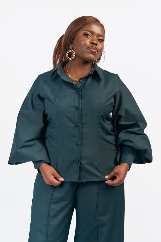 “Nia” Lantern Sleeve Two-piece- Dark Green