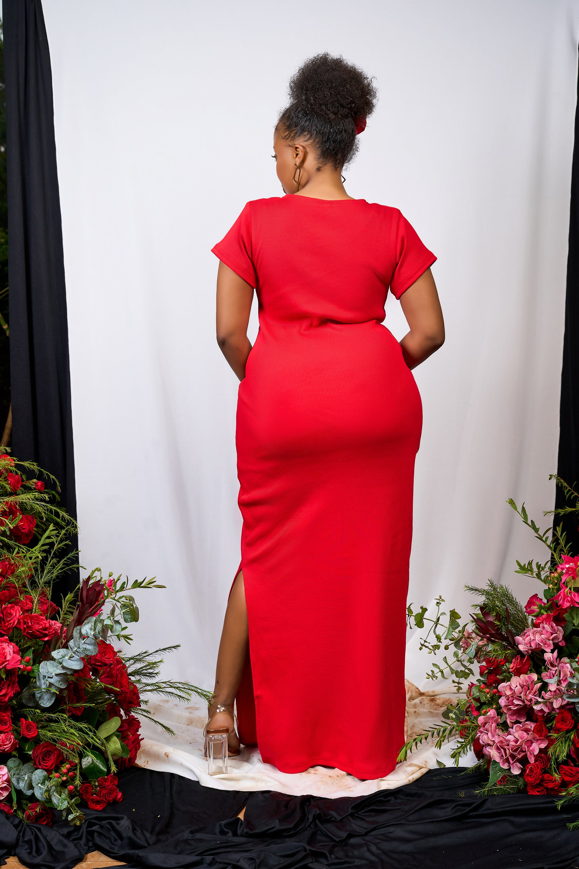 This maxi-length scarlet bodycon dress is the epitome of bold elegance. Crafted from a smooth, ribbed knit, the figure-hugging silhouette contours the body, accentuating natural curves with effortless grace. Pair with sleek heels and gold accessories for a statement look that turns heads from every angle.