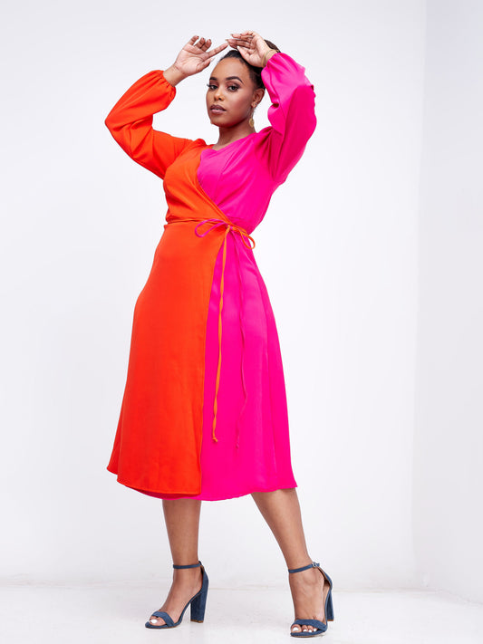 "It's a Wrap" Two Tone Midaxi Dress- Pink & Orange