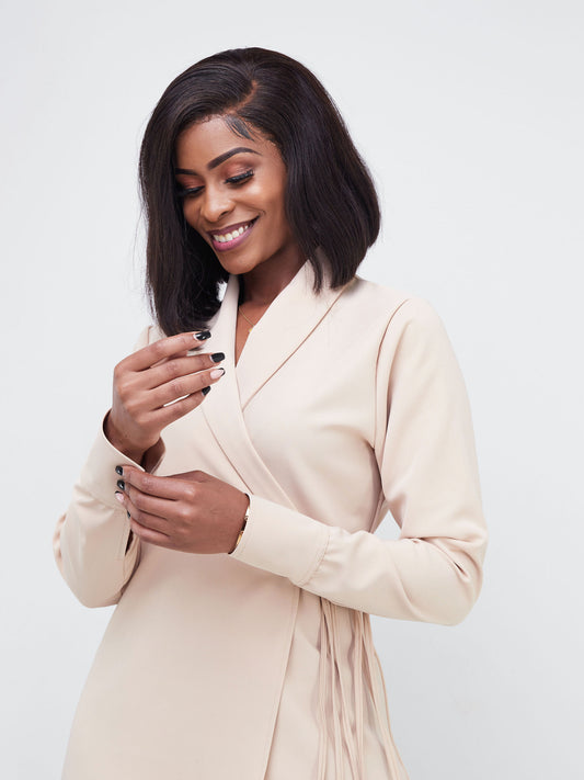 "Mamma Mia" Shawl Collar Wrap Dress- Beige