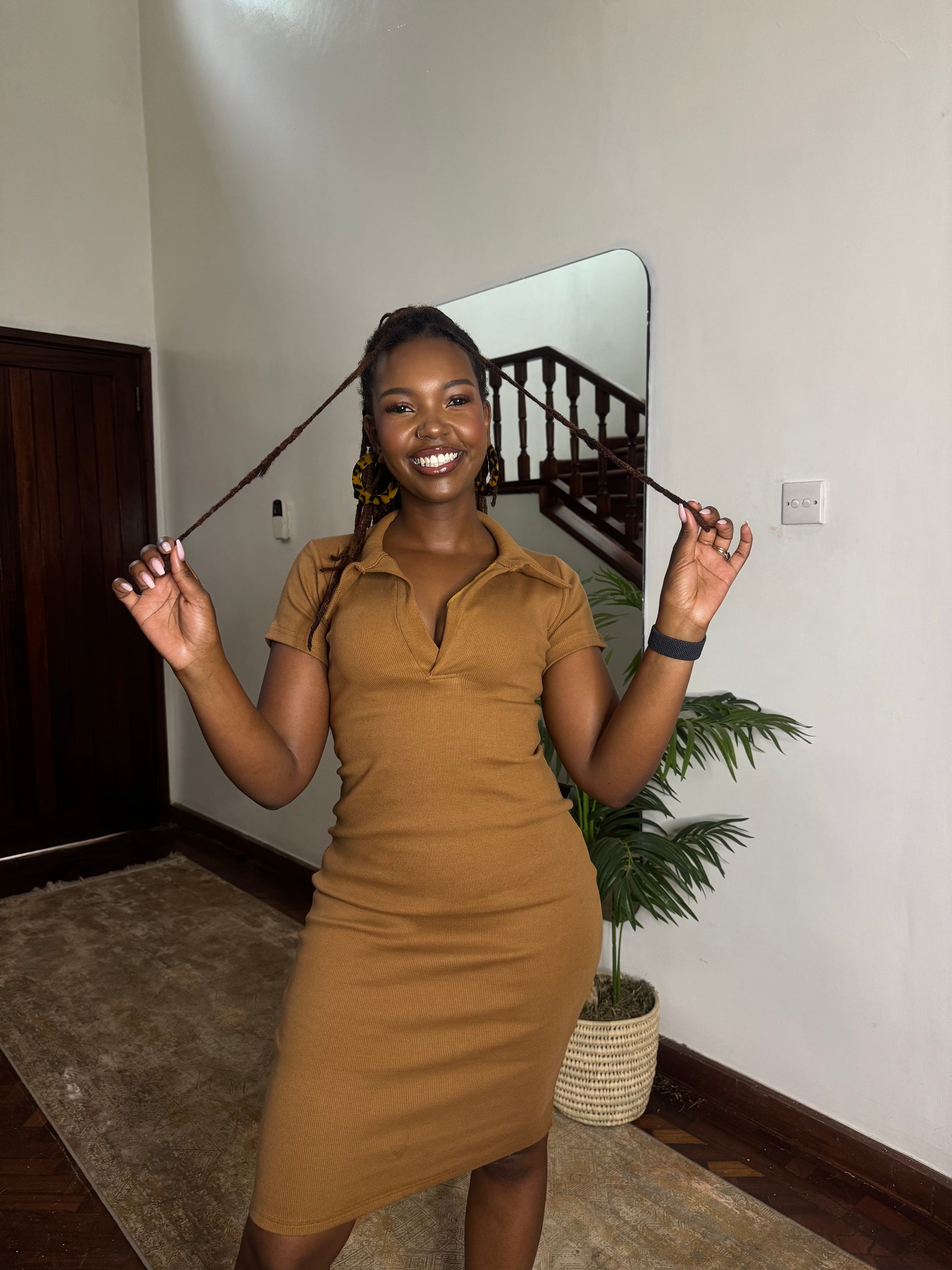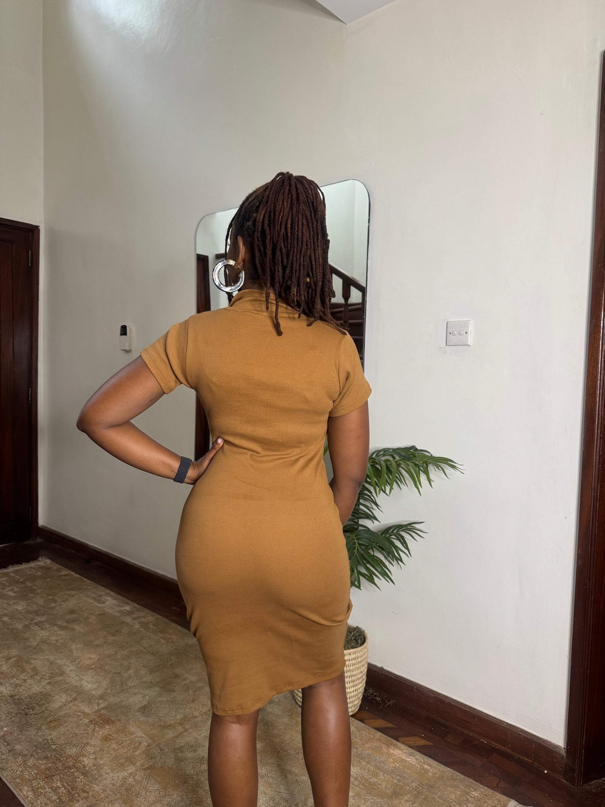 This cinnamon ribbed  bodycon dress makes a bold yet refined statement in a neutral colour. Crafted from a soft ribbed knit, it sculpts the body with a second-skin fit while offering comfortable stretch.