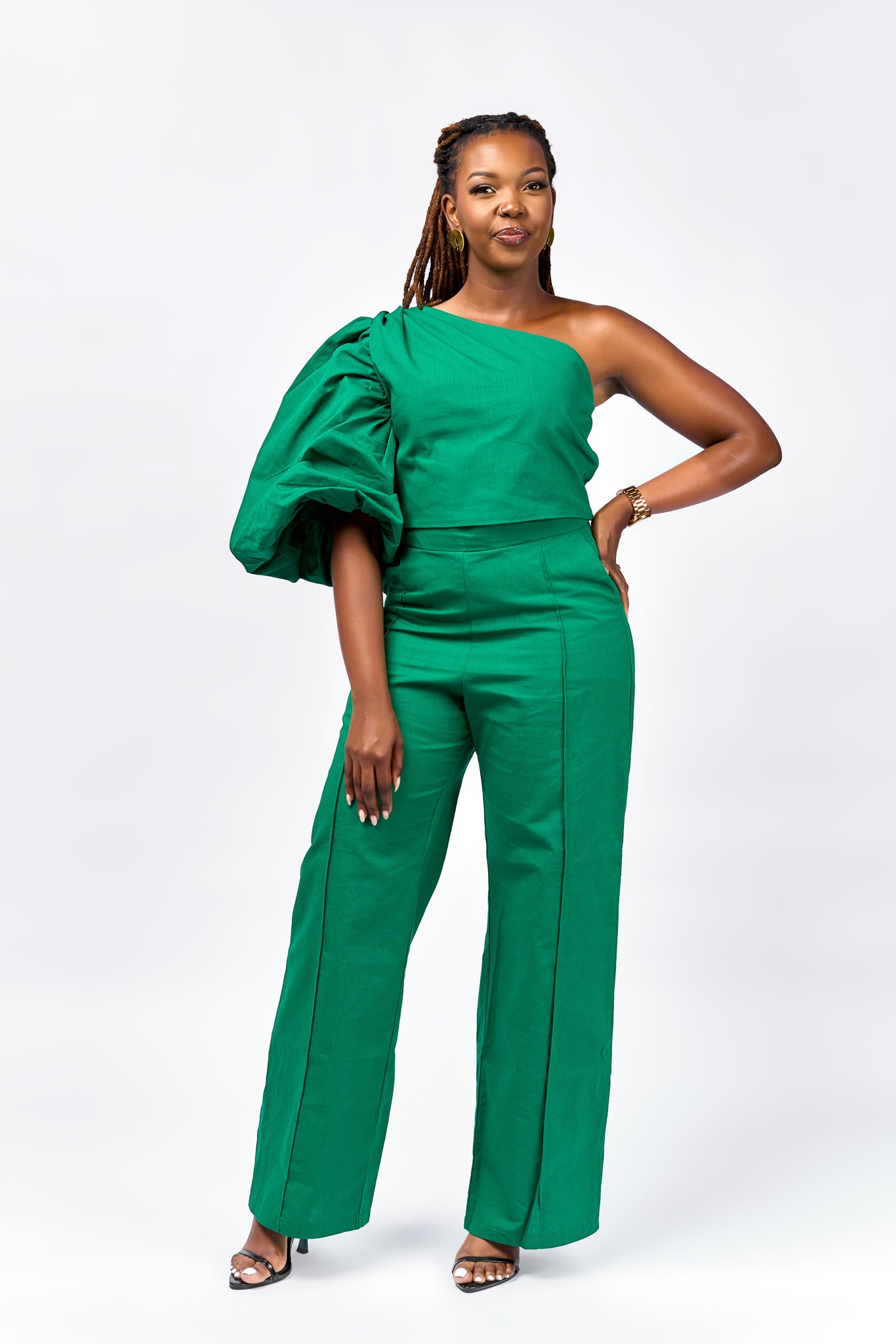 These green wide-leg pants deliver a power move in every step. Designed to elongate the frame and command attention, this piece is a modern essential for the woman who leads with style. Pair it with the matching crop shirt or a crisp white blouse for a look that means business, with a twist.