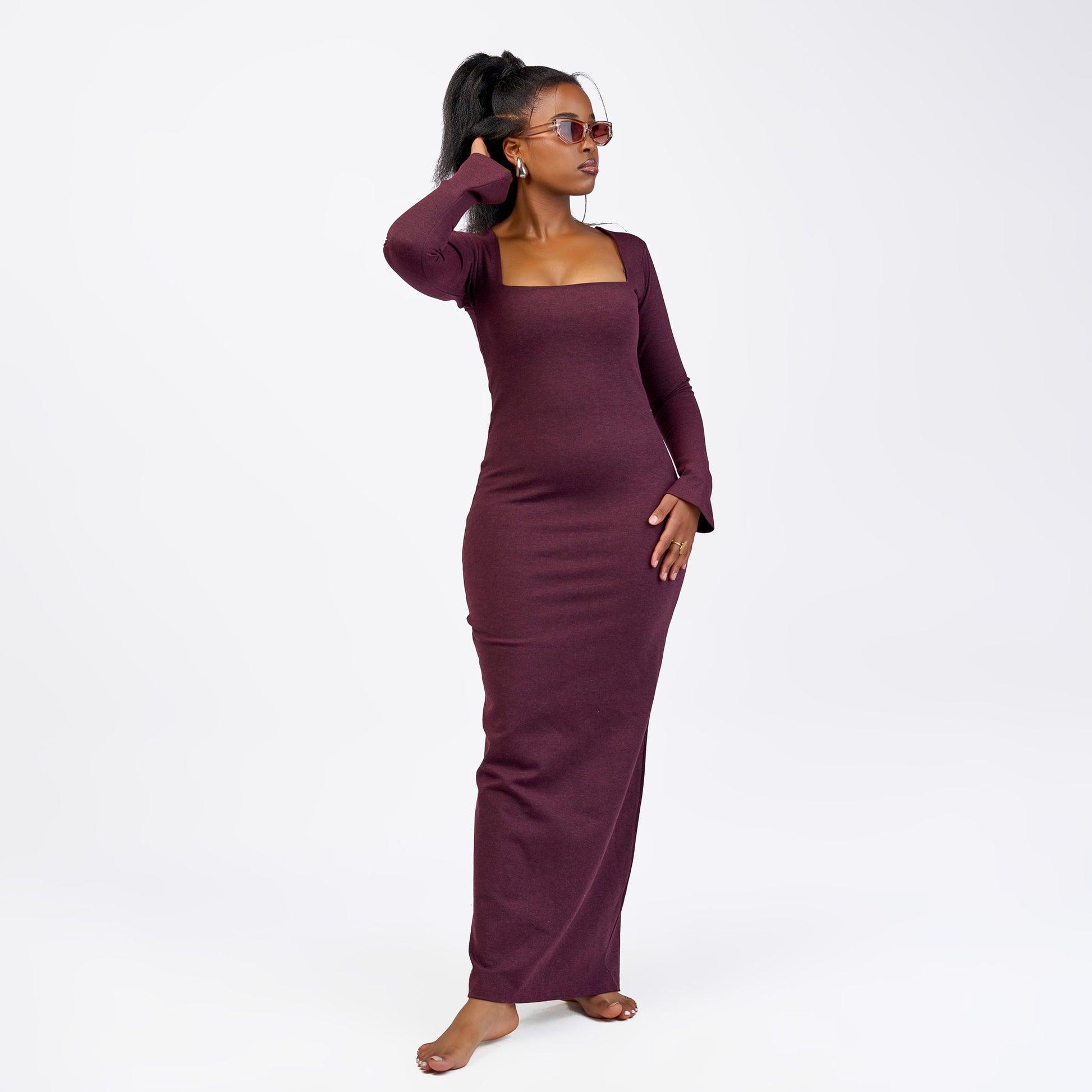 Refine your after-dark edit with this burgundy maxi dress, sculpted for a streamlined silhouette. The double-layered front bodice offers discreet support, while the square neckline introduces a contemporary edge. Crafted from a smoothing, quality fabric, the long sleeves lend an air of effortless sophistication. Elevate the look with a delicate chain. Length approx 155cm/61"